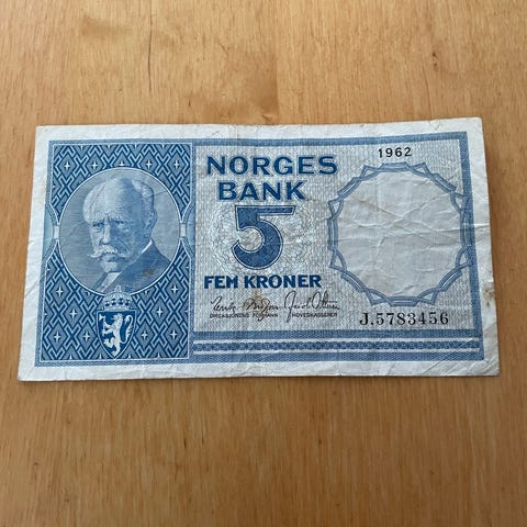 Norges Bank 5 kroner seddel fra 1962 K i blå farge. Sedlene har historisk motiv.Passer for samlere av norske sedler.
