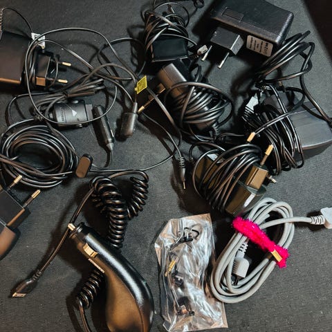 Diverse mobilladere til gamle mobiltelefoner, og headset og ledninger. Samsung, Nokia og Sony Ericsson.