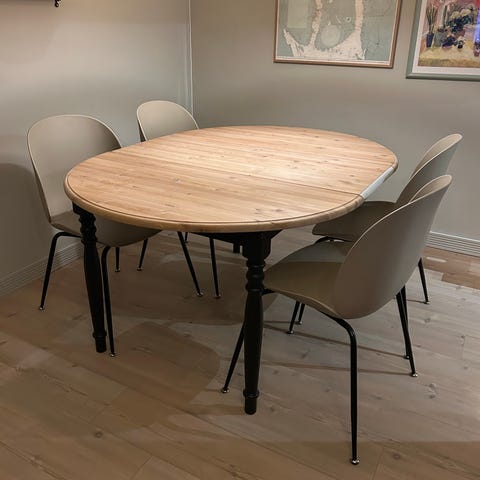 Massiv furu. Lasert grå. To finer ileggsplater (35cm hver) medfølger. Må hentes.