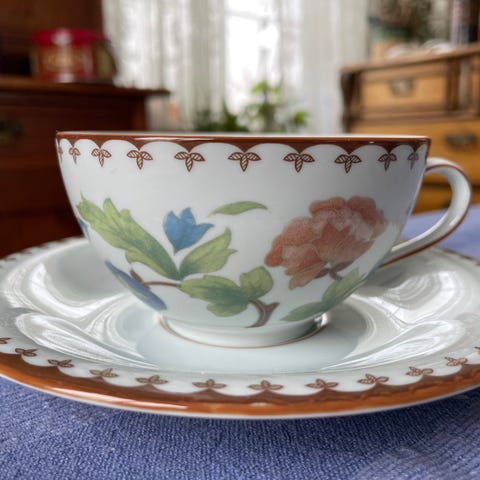 Derfor er det vanskelig å identifisere den nøyaktige produsenten uten andre kjennetegn eller spesifikk kunnskap om mønsteret. Mønsteret på koppen og asjetten ser ut til å være i Art Deco-stil, noe som stemmer godt overens med tidsrammen 1920-tallet.