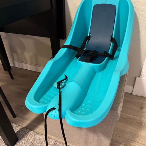 Svært pent brukt akebrett til baby/småbarn. Har vært brukt bare noen få ganger, så jeg ser ingen skader eller merker på det. Stødig konstruksjon og godt sete med belte.