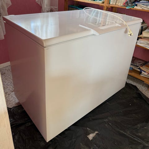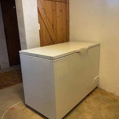 Godt brukt stor fryseboks som ikke brukes lenger. Den er ikke tint enda