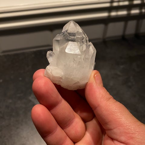 Naturlig kvarts / bergkrystall i rå og ubehandlet form. Fin krystallstruktur med glitrende overflate og naturlig brunlig matriks på baksiden. Flott som dekor, samlerobjekt eller til bruk i interiør, meditasjon eller steinsamling.