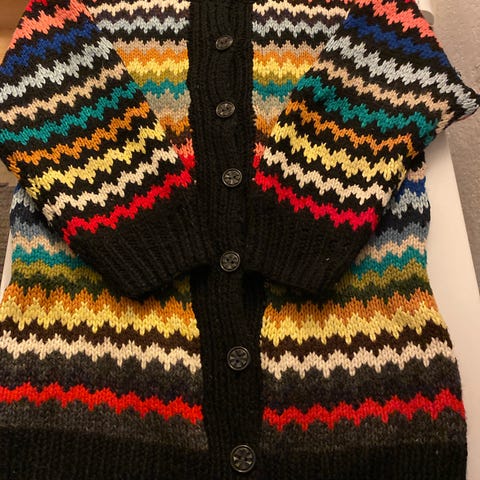 IKKE H&M. A-fasong. Lang genser. Egen oppskrift. Strikket selv. Alpakka ull, flerfarget, størrelse L. Genseren har et mønster med flettede detaljer på forsiden og er langermet. Noe mønster på ermene.