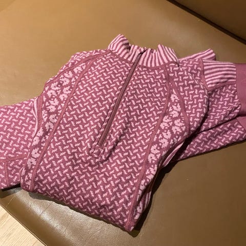 Kari Traa ullundertøysett i størrelse XL for kvinner. Settet består av overdel og underdel i beige farge med mønster. Laget av ullmateriale som gir isolasjon og komfort ved kaldt vær.