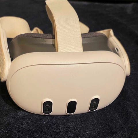 Meta Quest 3s VR-briller i hvit farge med to trådløse kontroller. Brillene er designet for virtuell virkelighet og har justerbar hodebøyle for komfortabel passform.