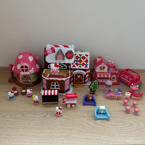 Hello Kitty barneleker og kreativt sett med ulike aktivitetsbøker, fargeleggingsutstyr, klistremerker og tegneutstyr. Inneholder flere bøker med illustrasjoner, fargeleggingsark, malesett, kritt, fargeblyanter og diverse tilbehør for kreativ lek og læring. Noen av bøkene er skriblet litt i.
