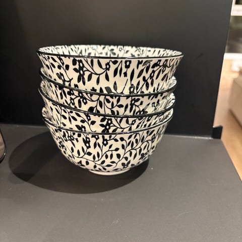 bolle i hvit keramikk med svart linjemønster. Passer til servering av mat og snacks. Enkel design som kan kombineres med annet servise fra Nille.