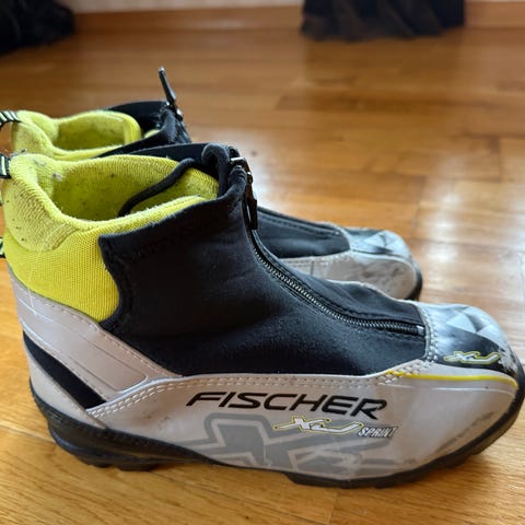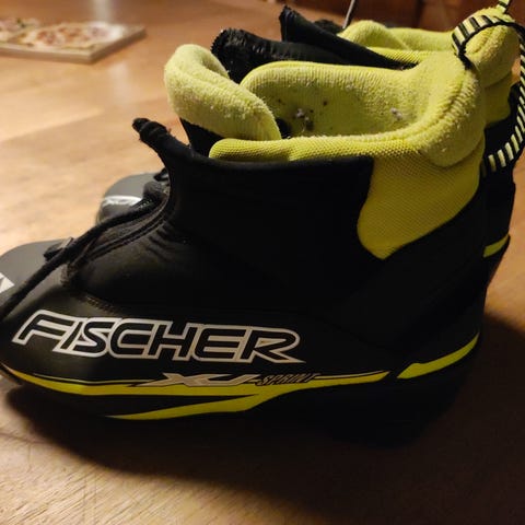 Fischer XC Sport langrennski sko i størrelse 32 med svart og gul farge. Skoene har glidelås foran og grovmønstret såle for feste på ski. Materialet og designet er tilpasset langrenn for god passform og funksjonalitet.