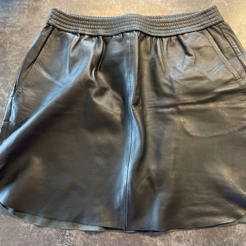 Second Female kort skinnskjørt i størrelse L, fargen grå. Skjørtet er laget av mykt skinn og har elastisk midje med snøring. Skjørtet er foret.