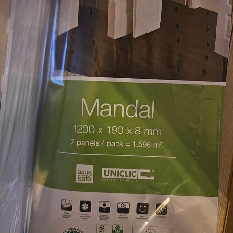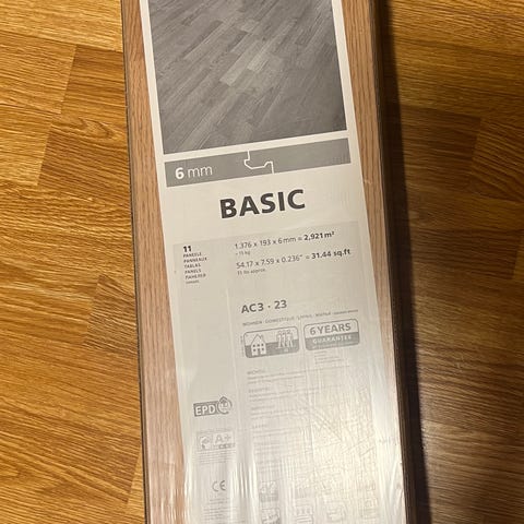 La laminat på soverom, men fikk en hel pakke til overs. Bildene viser pakken + laminaten på gulvet er for øvrig samme som det som ligger i pakken, dersom man lurer på hvordan det blir seende ut i virkeligheten. Vi er veldig fornøyde.