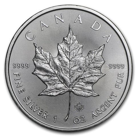 Canada Maple Leaf sølvmynter med vekt på 1 oz. Mynten har et motiv av et lønneblad på forsiden og portrett av dronning Elizabeth II på baksiden. Laget av rent sølv med finhet 9999.