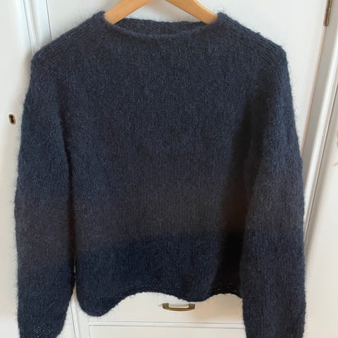 Strikket i 2 tråder, Lana grossa silkhair og Merinor pure merino light. Litt dyp vinrød farge. Måler lengde 56 cm, bredde målt tvers over 41cm, armlengde 45cm.