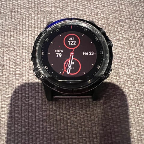 Garmin Fenix 5X GPS-multisportklokke med svart reim. Klokken har flere funksjoner for sport og trening, inkludert GPS-navigasjon og pulsmåling. Egnet for bruk både til hverdags og ulike utendørsaktiviteter.