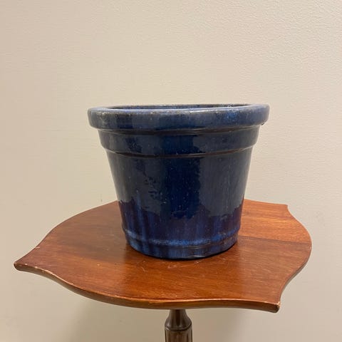 Blå keramisk blomsterpotte med hull i bunnen for drenering. Potten har en rund form og en glassert overflate.
