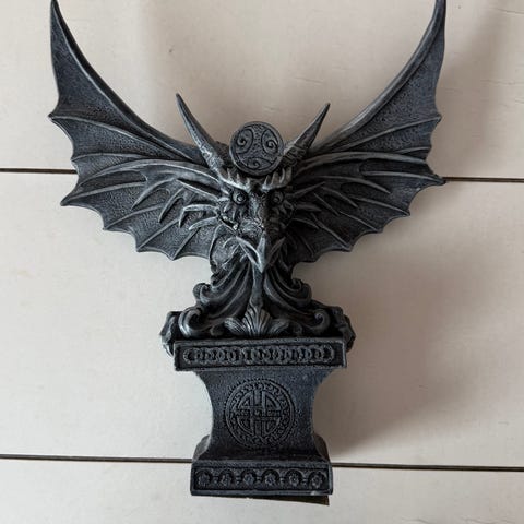 Drageskulptur med glassplate. Dragefiguren har detaljerte skjell og sitter på en sokkel.