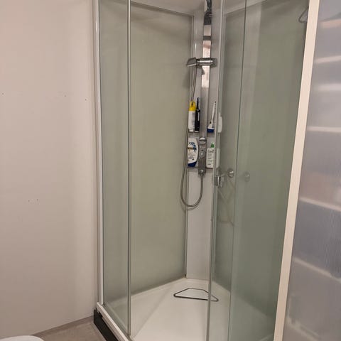 Dusjkabinett med frostede glassdører og termostatstyrt dusj