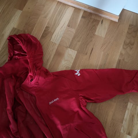 Jean Paul Sporty jakke for dame i størrelse M. Jakken har en hvit base med blått rutemønster og svarte detaljer på skuldre og albuer. Den er laget av 100 % polyester og har et sporty design. Jakken har hette og er egnet for ulike sportsaktiviteter.