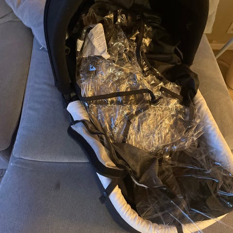 Det følger med liggedel, regntrekk og nødvendige braketter for å feste liggedelen. Følger også med noen braketter som jeg tror er for å feste på maxi cosi cabriofix bilstol.