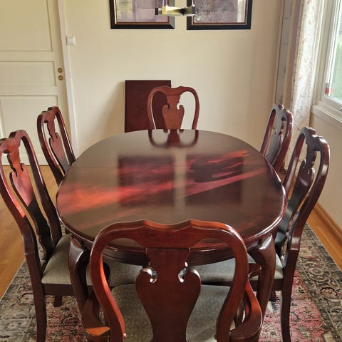 Pen mahogni spisestue med 6 stoler selges. Den har en løs ileggsplate. På bildene ser man bordet, både med og uten ileggsplate.