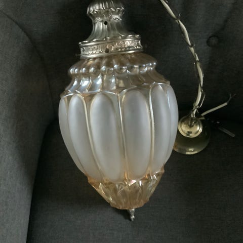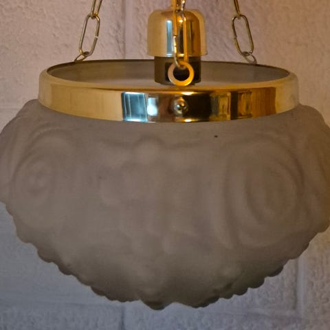 Lampen er fra 1980 tallet. Den er merket Konsthandverk AB, Art nr 3204. Typ nr 204, se bilde. Selve lampen er ca 45 cm i diameter. Høyde er ca 30 cm. Den er i hvitt glass og gir et koselig, lunt lys. Lampen er pent brukt og i god stand.