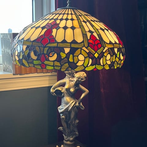 Lampen gir et koselig lys, her forsøkt vist ved hjelp av 2 stk ledlys plassert inni