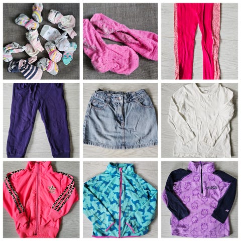 Klespakke str 98/104 med en del ull (hjemmestrikk og ullundertøy), fleecejakke og fleecehals. Noen flekker og andre mindre skavanker kan forekomme.