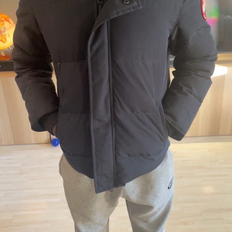 Canada Goose vinterjakke i størrelse S. Jakken er svart og laget med dun som isolasjonsmateriale. Designet for menn og egnet for kalde utendørsforhold.