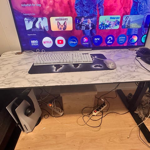 Lyst grått skrivebord med elektrisk heve- og senke-funksjon. Laveste høyde er 70 cm og høyeste høyde er 125 cm. Heve/senk fungerer helt utmerket.