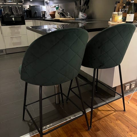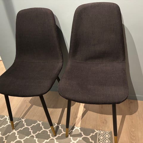 3 stoler fra Jysk. Husker ikke navnet. Selges for kr 250 pr stk. Kjøpt for noen år siden, men er lite brukt. Stått i en leilighet som har vært lite brukt. Selges da vi har investert i nye stoler. Veldig gode å sitte på. Blågrønn farge. Den ene er litt mer slitt i setet enn de andre to. Selges gjerne samlet, men også en og en.