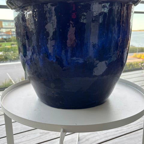 Blå keramisk blomsterpotte med en diameter på cirka 16 cm. Potten har en glasert overflate med noen synlige bruksmerker og et avskallet område. Den har dreneringshull i bunnen for vannavløp.