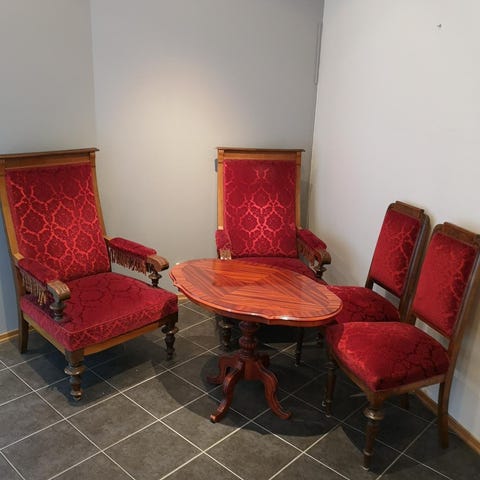 Gammel lakk er fjernet og de er nå satt inn med ibenholt, en mørk brun farge. De har bouclestoff på setene - men dette kan enkelt byttes til en annen type dersom man ønsker det.