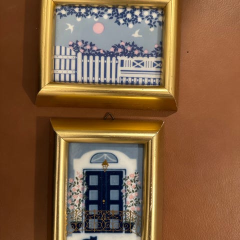 PP Porsgrund Håndverks-Studio kunstverk i ramme, designet av Anne Marie Pedersen. To bilder i svart-hvitt med dekorative motiver, innrammet i gullfargede rammer. Rammer med oppheng for veggmontering. Designet på 70-tallet.