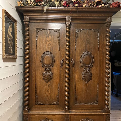 Veggskap i tre med glassdør og to hyller. Skapet har dekorative utskjæringer på toppen og en låsbar dør med messinghåndtak. Passer til oppbevaring av små gjenstander eller dekorative elementer.