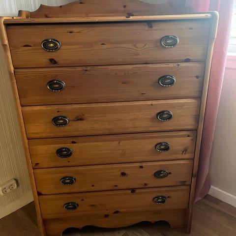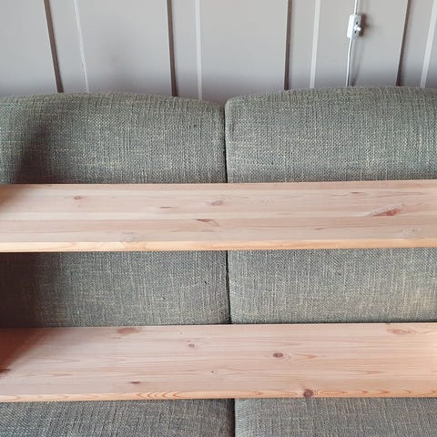 Jeg selger også en 2-"etasjes" vegghylle av furu. Også den med pent utforma sider. Samt et retro speil m/ hylle, av furu. Se egne annonser.