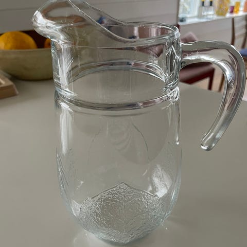Hadeland Glassverk kanne i klart glass med rød kant.