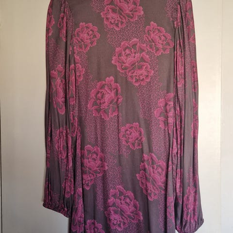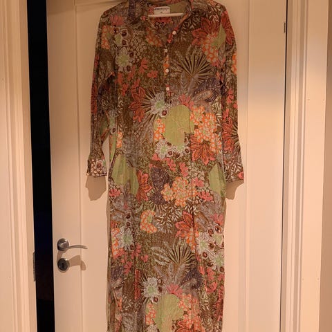 Kjole som kan brukes som lang skjorte eller jakke, og har gullknapper så den også kan kneppes helt igjen. Bør ha underkjole. Stoffet har en gulbrun bunnfarge med noen gulltråder sydd inn på langs. Selges da den er for liten. Flatterende farger og fasong.