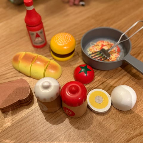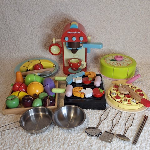 lekemat kjøkkenutstyr sett med mikser, brødrister, blender og ulike gryter og panner i metall og plast.