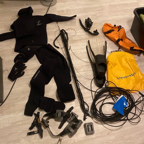 Selger fridykker utstyrspakke premium fra Frivannsliv. Str S i sko og hansker, str 2 i drakten. 40-42 i fotlommene. Det ka være aktuelt å selge deler av utstyret, ta kontakt :) Kun brukt to ganger, i topp stand. (Litt bruksmerker på finner). Flåten avviker fra den opprinnelige pakken.