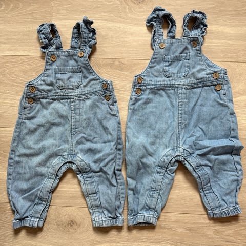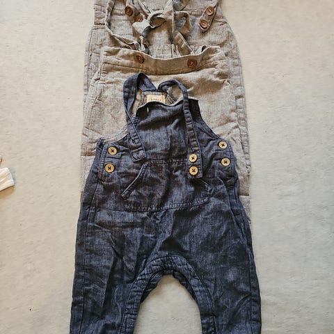 Selger to pent brukte selebukser fra HM i str 86, en blå i denim i bomull og en beige i lin.