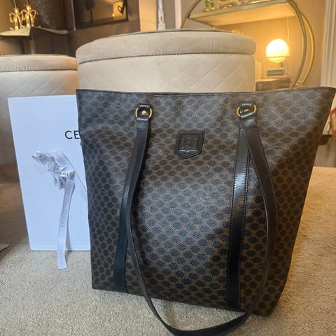 Klassisk vintage Céline tote i den ikoniske Macadam-printen. Vesken er i fantastisk stand med tanke på alderen, og fremstår velholdt med pene detaljer. Tidløst design som passer både til hverdags og jobb.