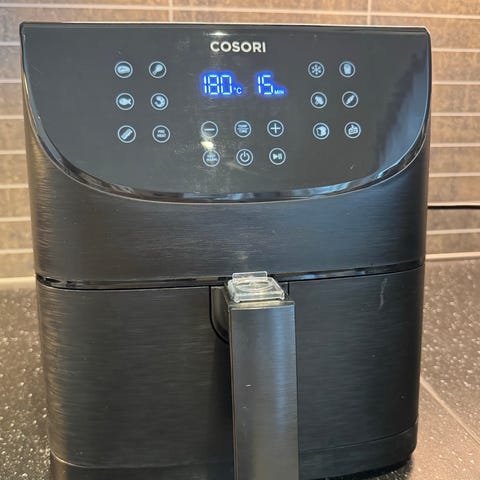 Cosori Airfryer med digitalt kontrollpanel. Inkluderer kurv, rist og ekstra tilbehør for matlaging. Designet for å tilberede mat med varmluftsteknologi.