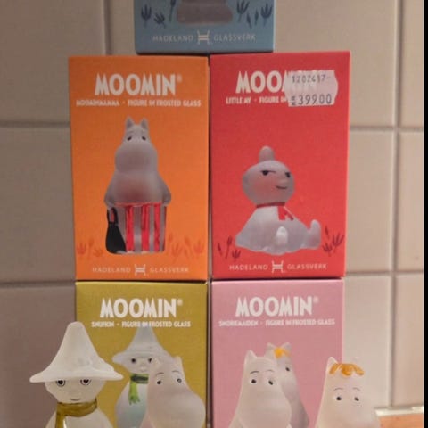 Iittala glass med illustrasjoner av Mummitrollet-karakterer.