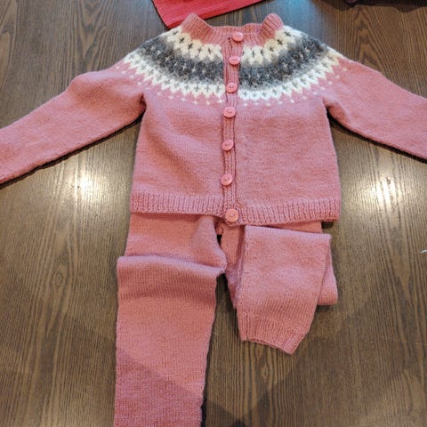 Godt og varmt sett. Bestående av genser, bukse og skjørt... Hjemmestrikket.. Små feil i strikken kan fårekomme men ingen hull.. Nydelig sett. Deilig å gs i bhg ...
