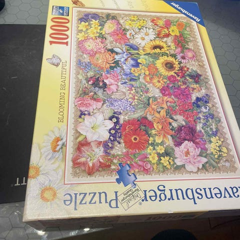 Ravensburger solnedgang og sykler puslespill med 1000 biter. Motivet viser en solnedgang med sykler og blomster i forgrunnen. Puslespillet er laget av papp og passer for voksne og eldre barn.