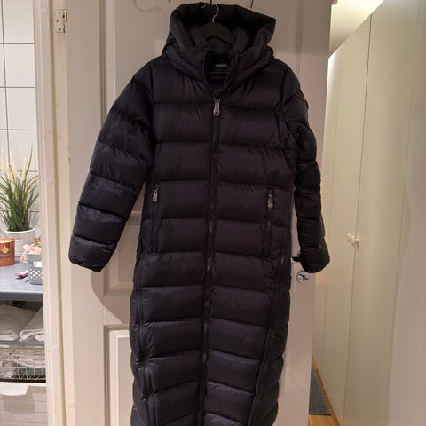 Parajumpers i størrelse M for damer. Jakken er svart og laget av dun som isolasjonsmateriale. Den har hette med pelskant og lang lengde. Jakken er egnet for utendørs bruk i kaldt vær. Jakken bærer preg av at den er godt brukt. Lite hull nederst på jakken, se bilde. Noe sminke på krage,- ikke forsøkt fjernet.