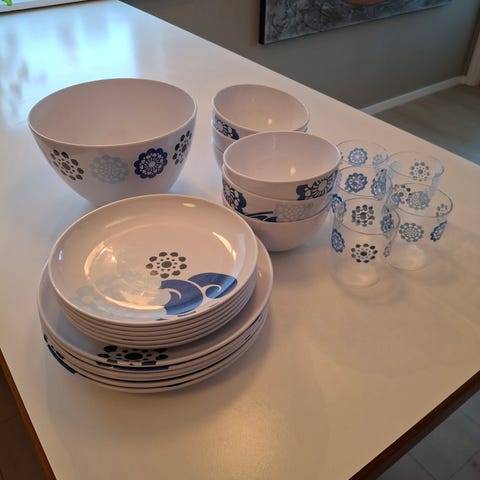 Komplett campingkjøkken med tallerkener, skåler, kopper, bestikk, kjøkkenredskaper, grillutstyr og sammenleggbar vannkanne. Noe ubrukt. Perfekt til camping, hytte eller bobil.