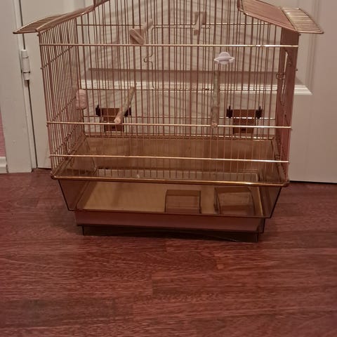 Stor dør i front , hele toppen kan åpnes slik at papegøyen kan sitter der på stender
