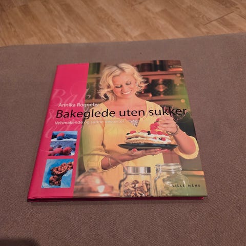 Annika Rognlien Bakeglede uten sukker kokebok med oppskrifter på sukkerfrie bakverk og desserter. Boken inneholder veiledning for baking uten tilsatt sukker, med fokus på sunne alternativer.