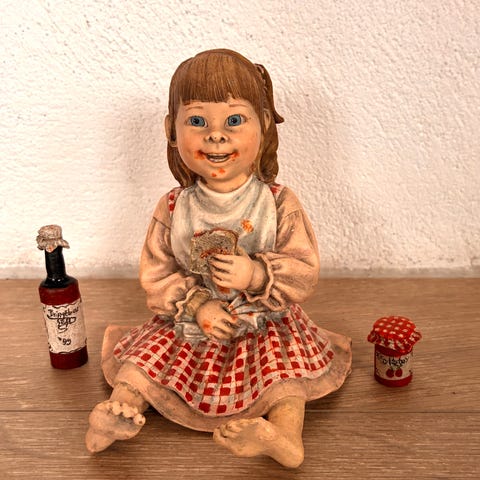 Candy Design Norway figurer av barn, en i gult regntøy og en i blå kjole- som kysser. Carl Larsson. Har noen skader (se bilder).